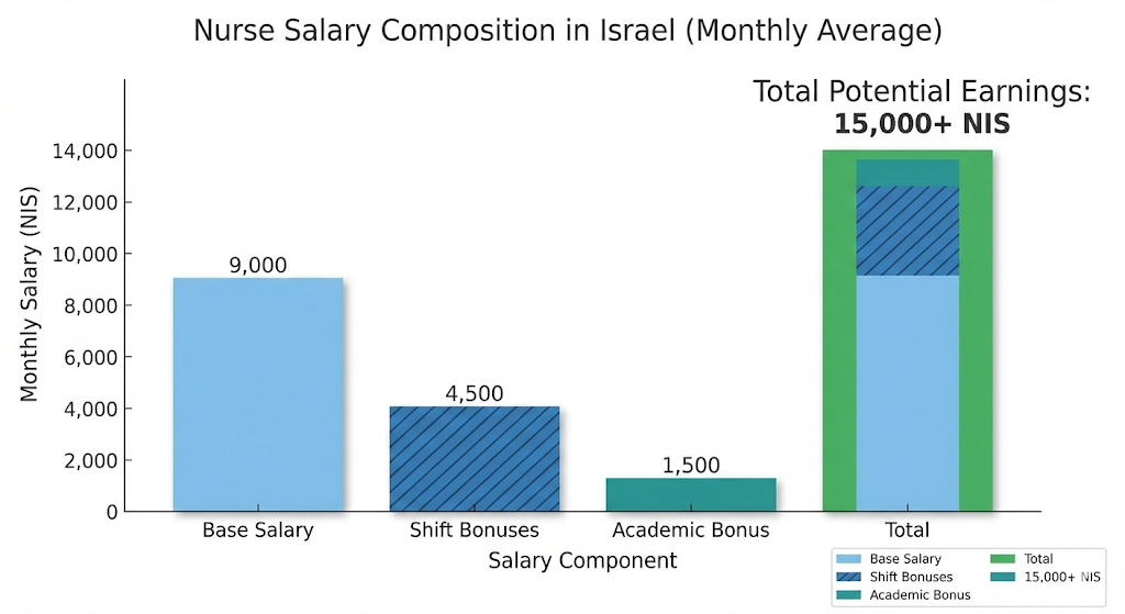 - תוספת אקדמית: תואר במדעי האחיות (B.S.N) מעניק תוספת שכר קבועה לעומת אחות ללא תואר (שכמעט ואין היום).